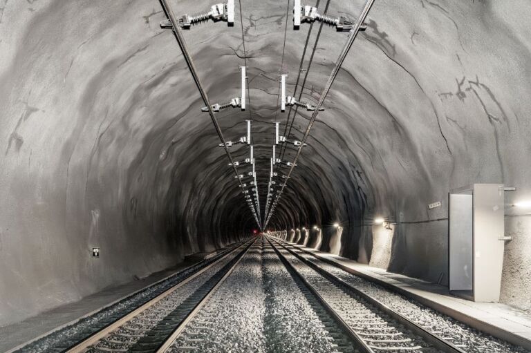 Rigid overhead conductor rail in the Vereina Tunnel and at RhB loading stations