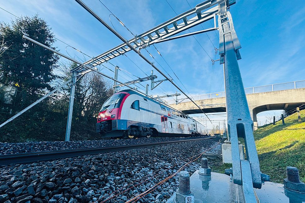 The limited space was a particular challenge, with installation of a conventional overhead contact line made impossible by the low clearance height. SBB therefore decided to install a rigid overhead conductor rail over a length of around 50 metres on both tracks.