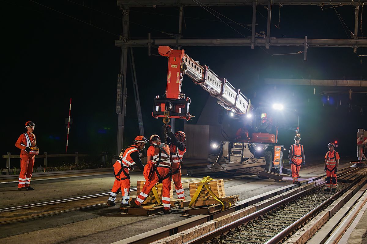 • Monteure in orangefarbener Schutzkleidung heben und montieren nachts mit einem Kran eine grosses Joch über einem Bahngleis, wobei Baugeräte und Scheinwerfer die Szene am Tunnelportal beleuchten.