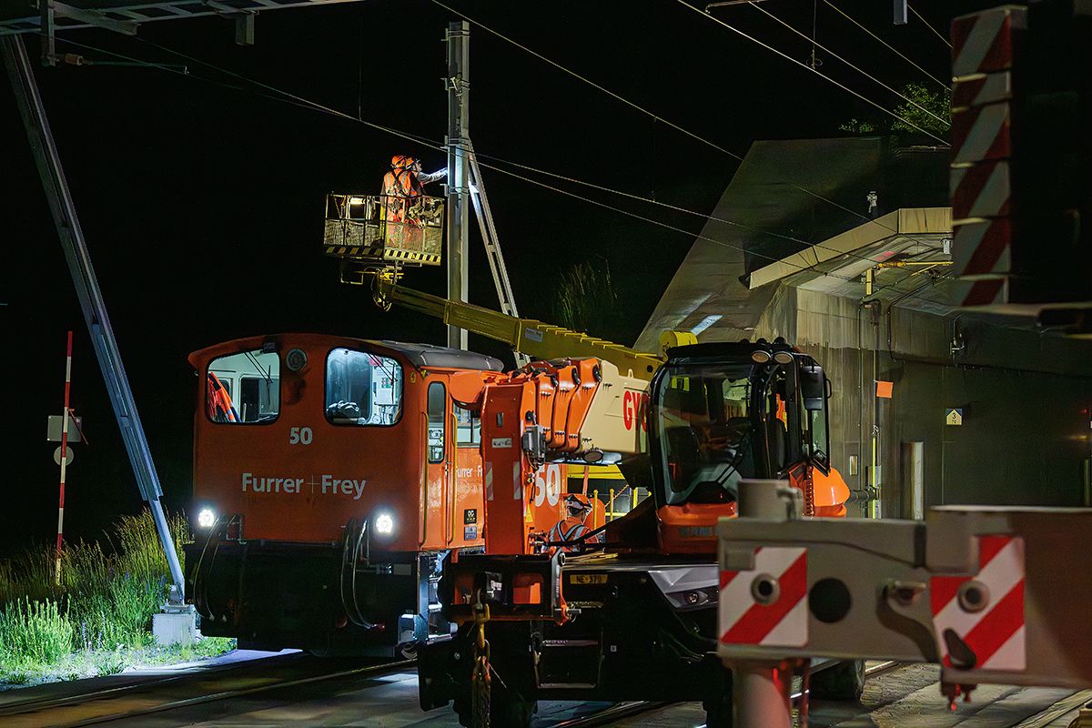 Zwischen November 2023 und November 2025 führten wir die vollständige Demontage der bestehenden Kettenfahrleitung aus und übernahmen gleichzeitig die Lieferung und Montage des Deckenstromschienensystems. Sämtliche Arbeiten erfolgten in nächtlichen Sperrpausen, wobei die Fahrleitung jeweils am folgenden Morgen wieder in Betrieb genommen wurde. Im Winterfahrplan war die effektive Arbeitszeit auf rund drei Stunden pro Nacht begrenzt, wodurch sämtliche Arbeitsschritte innerhalb dieses engen Zeitfensters ausgeführt werden mussten.
